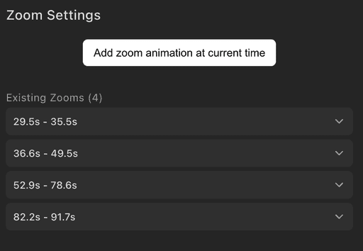 Multi-select for zoom animations: Select multiple zoom animations at once to delete them in bulk. Supports click, Cmd+Click for individual selection, and Shift+Click for range selection.