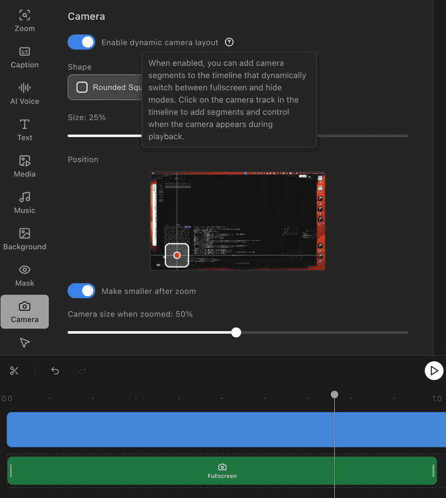 Highlight segments: Draw attention to any area of your recording by dimming the rest of the screen. Adjust the highlighted region, roundness, and feather for a polished look. Available to all users.